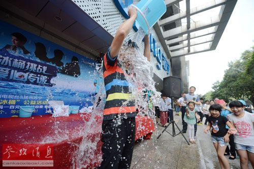 8月22日,揚州市的一名愛心志愿者在參加“冰桶挑戰”活動。 新華社發(孟德龍 攝)