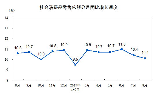 2017年8月份,社會(huì)消費(fèi)品零售總額30330億元,同比名義增長(zhǎng)10.1%(扣除價(jià)格因素實(shí)際增長(zhǎng)8.9%,以下除特殊說(shuō)明外均為名義增長(zhǎng))。其中,限額以上單位消費(fèi)品零售額13229億元,增長(zhǎng)7.5%。